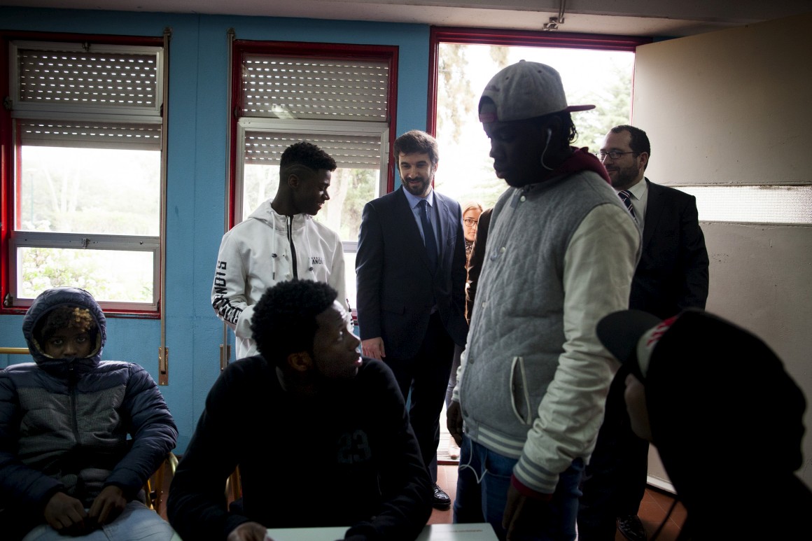 da educação a uma escola (no início do 2.º período do actual ano lectivo). Em primeiro plano, vêem-se quatro presumíveis alunos da escola (de costas para o ministro e comitiva): dois deles com boné e um outro com gorro, em plena sala de aula. Palavras para quê? Não custa entender: estão à vista os enormes desafios a que as escolas, localizadas em zonas sensíveis, têm que fazer frente...